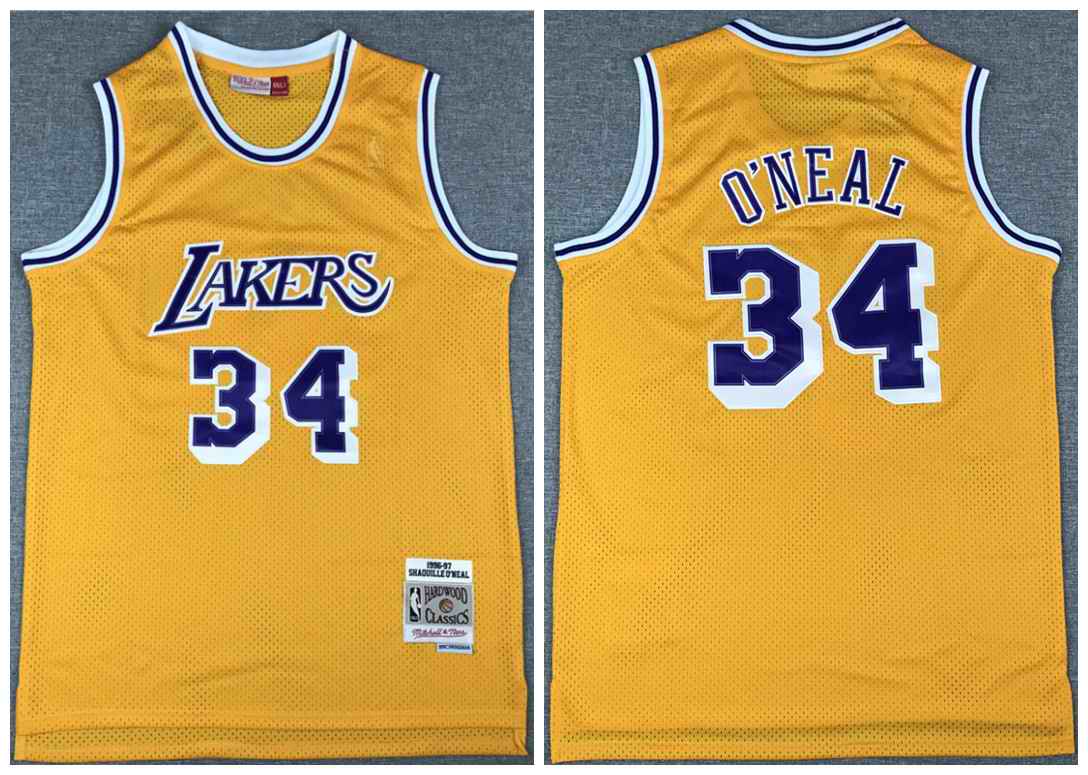 Men's Los Angeles Lakers #34 Shaquille O'Neal Gold Throwback Stitched Jersey