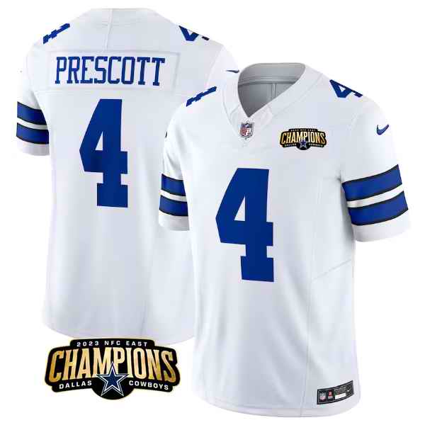 Men's Dallas Cowboys #4 Dak Prescott White 2023 F.U.S.E. NFC East Champions Patch Stitched Football Jersey